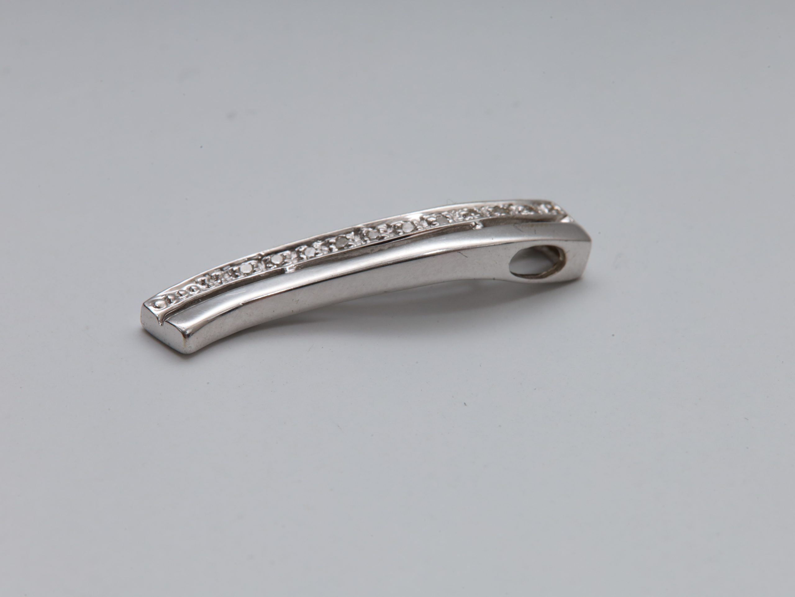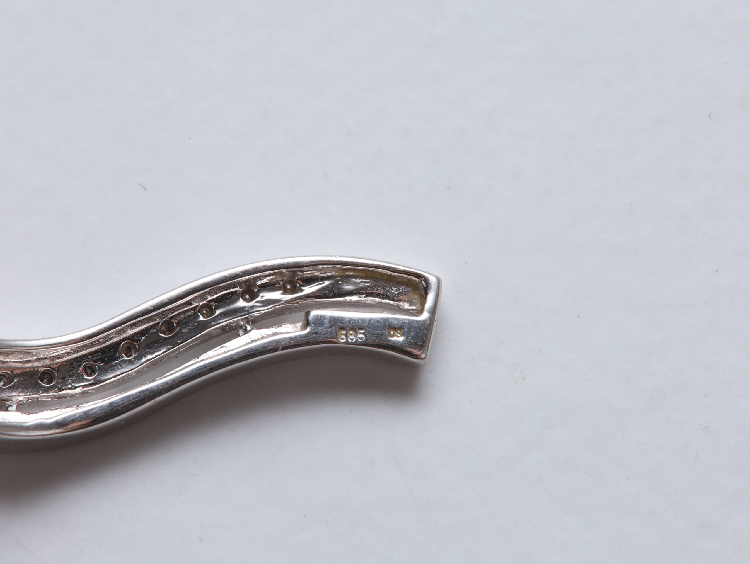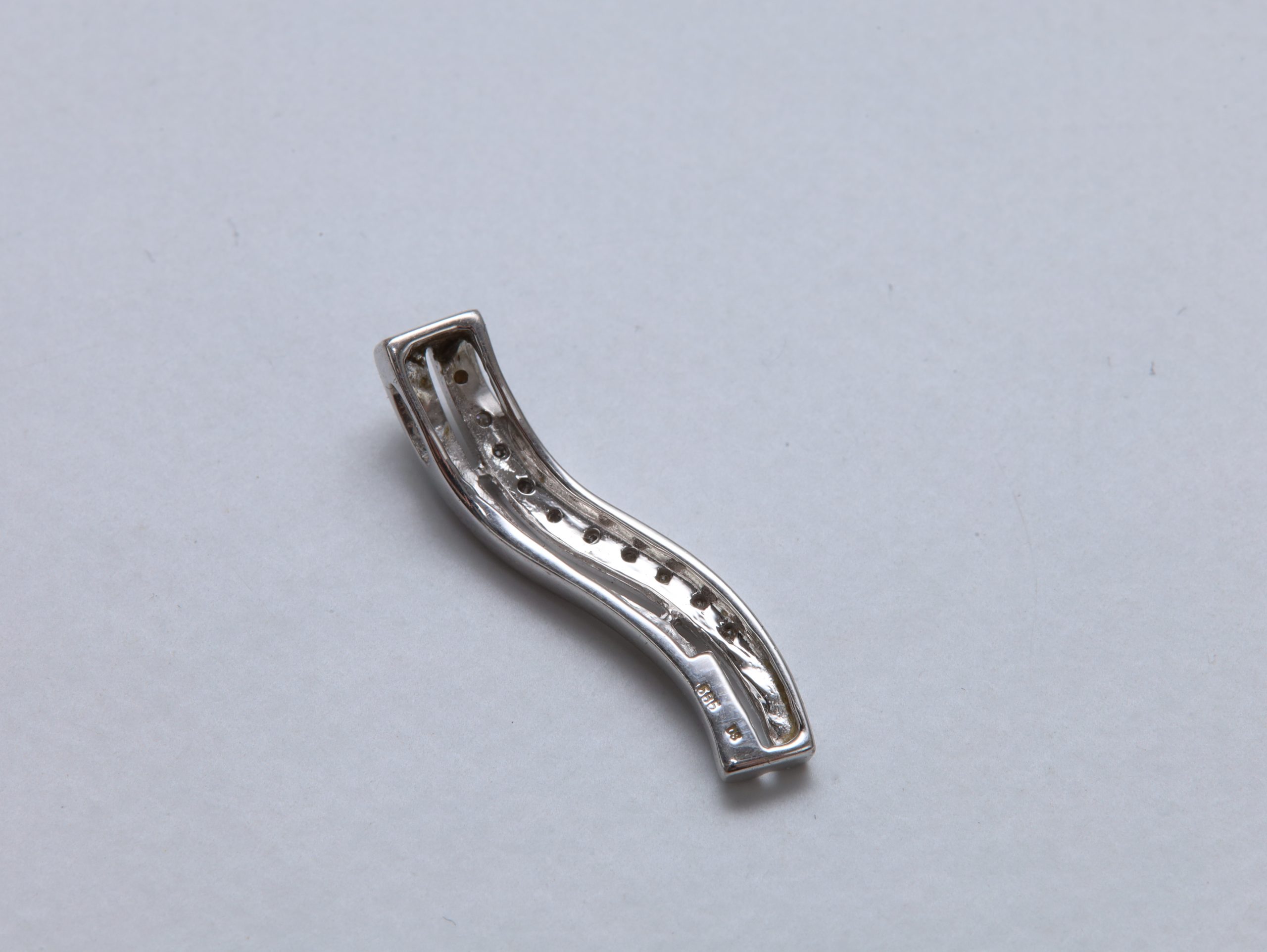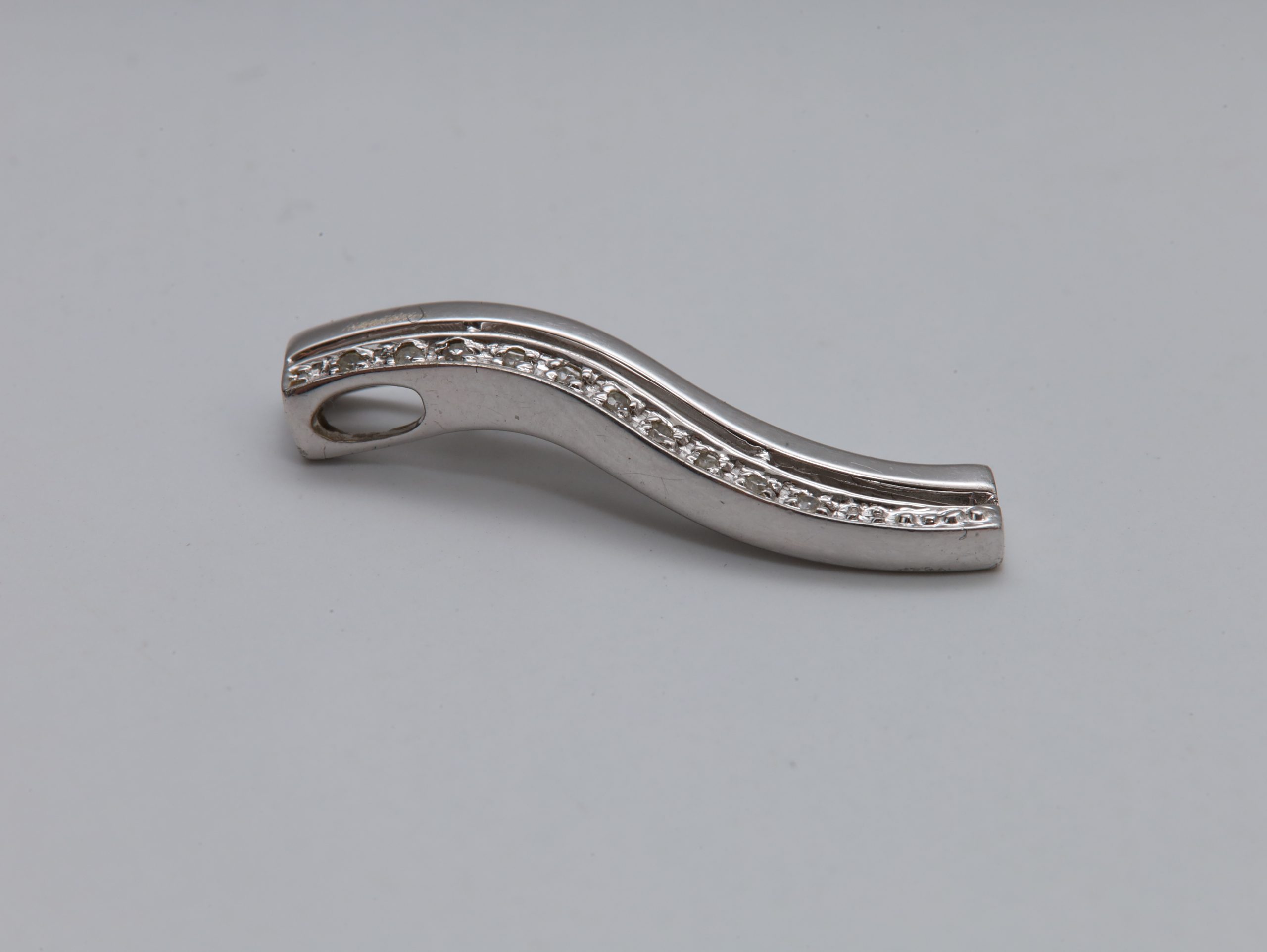 Eksklusivt anheng i **585 hvitt gull**, besatt med briljantslipte diamanter i en elegant, bølgende form.