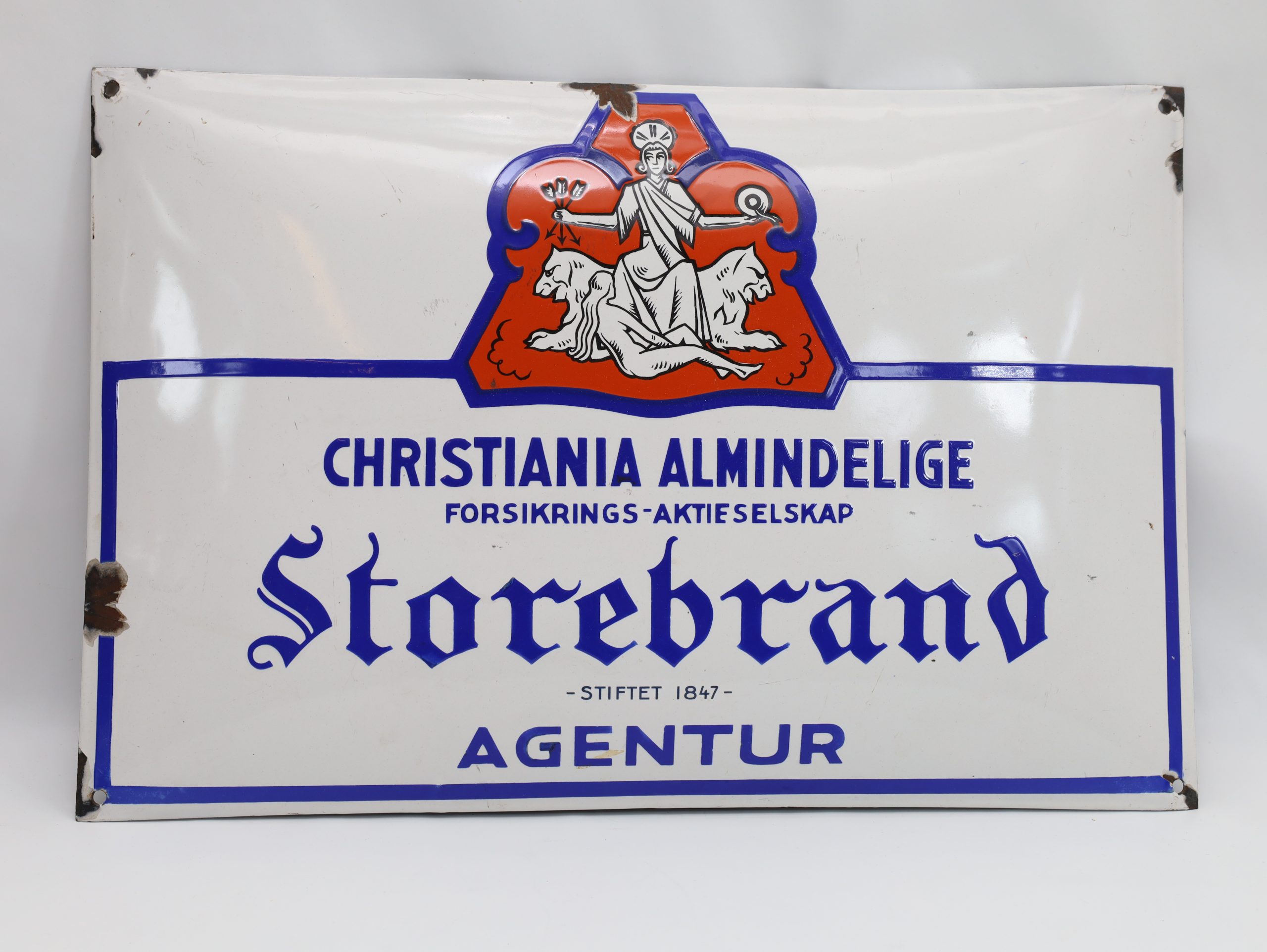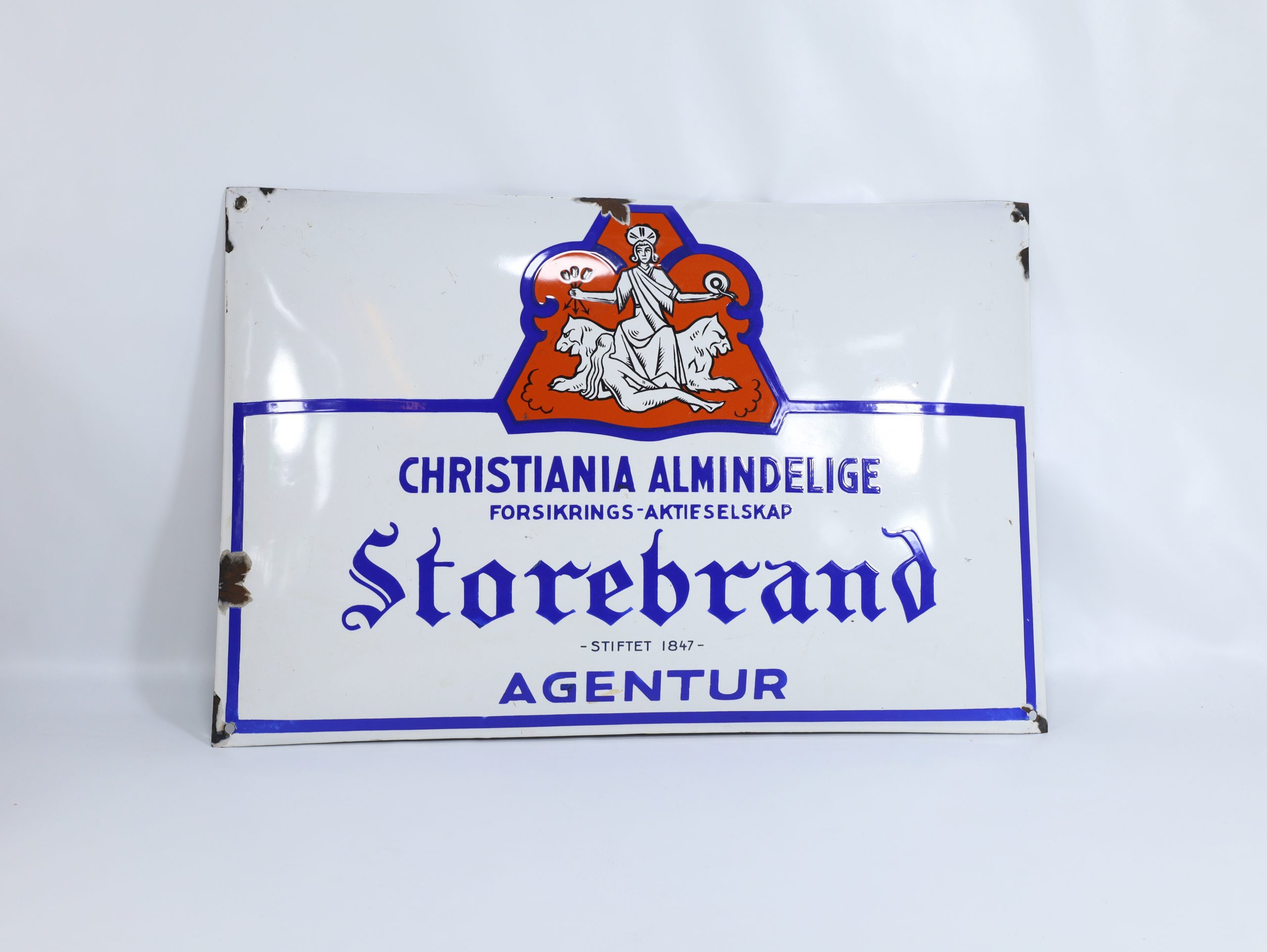 Et flott dekorativt emaljeskilt med logoen til Christiania Almindelige Forsikrings-Aktieselskab (“Storebrand Agentur”). Et stykke norsk forsikrings-og reklamehistorie, perfekt for samlere, interiør eller som statement-dekorasjon.