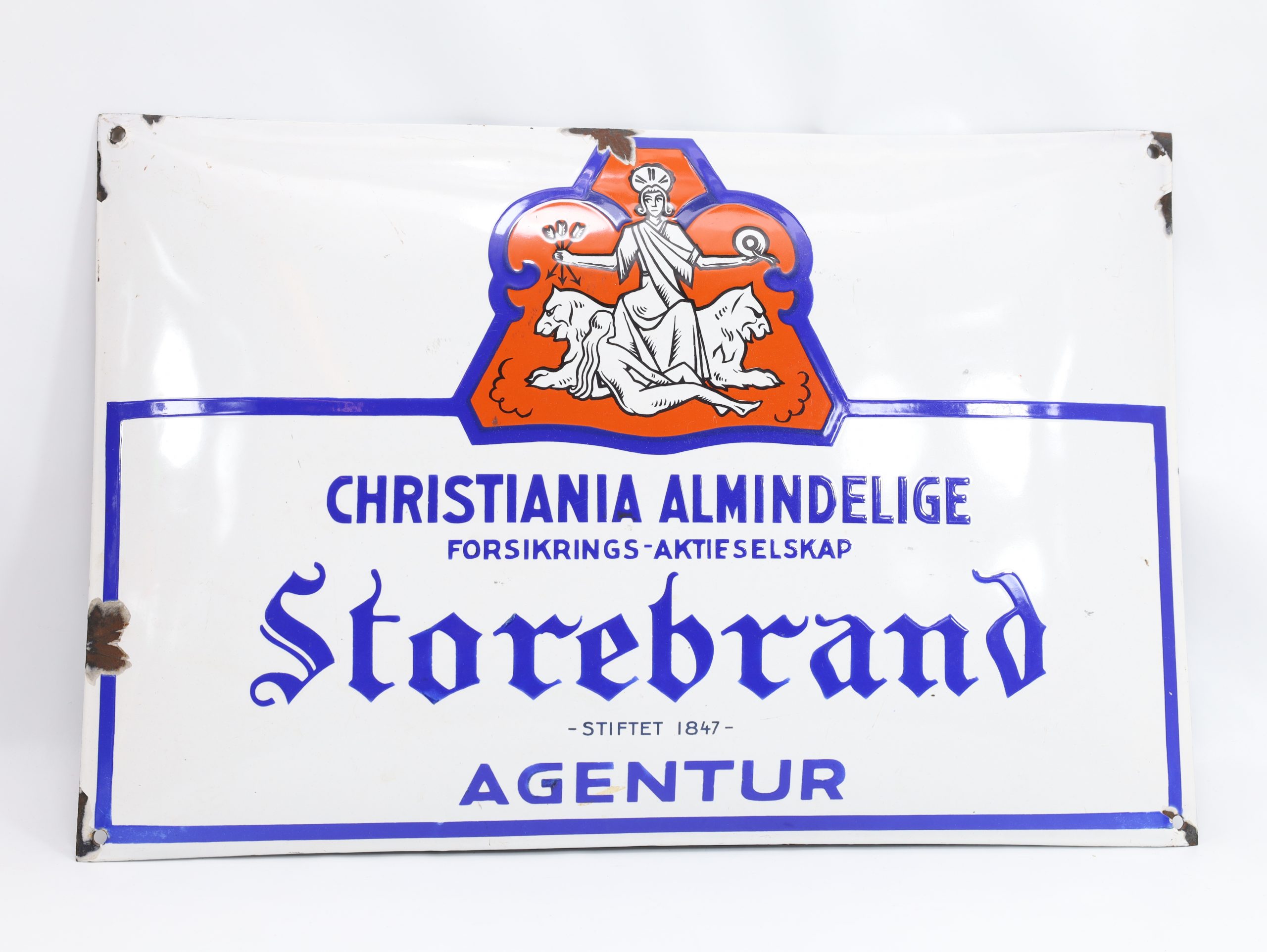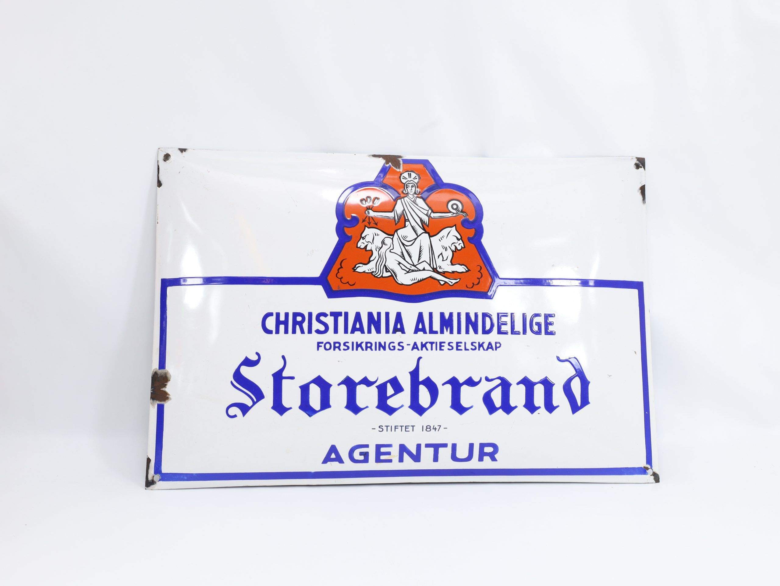 “Christiania Almindelige Forsikrings-Aktieselskab Storebrand” er en av Norges eldste og mest kjente forsikringsselskaper. Skiltet brukes av agentur-representasjon; disse skilt var vanlig på kontorer eller agentkontorer. Emaljeskilter fra denne epoken er ettertraktet blant antikvitetsinteresserte og reklame-samlere.