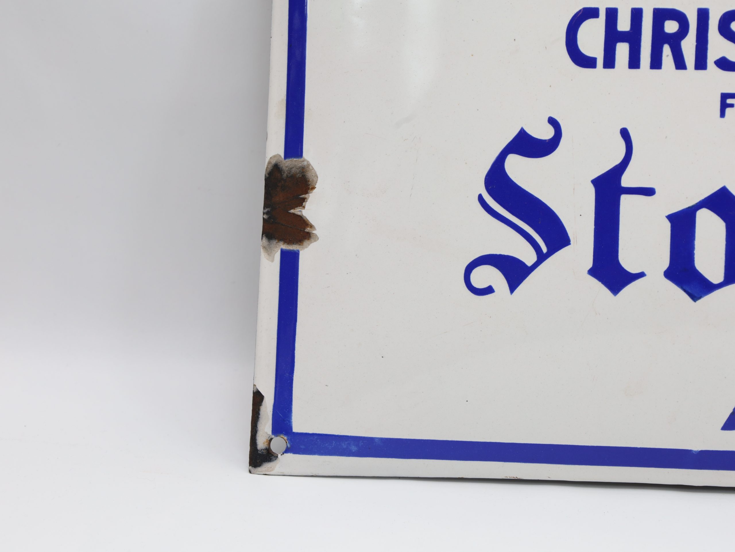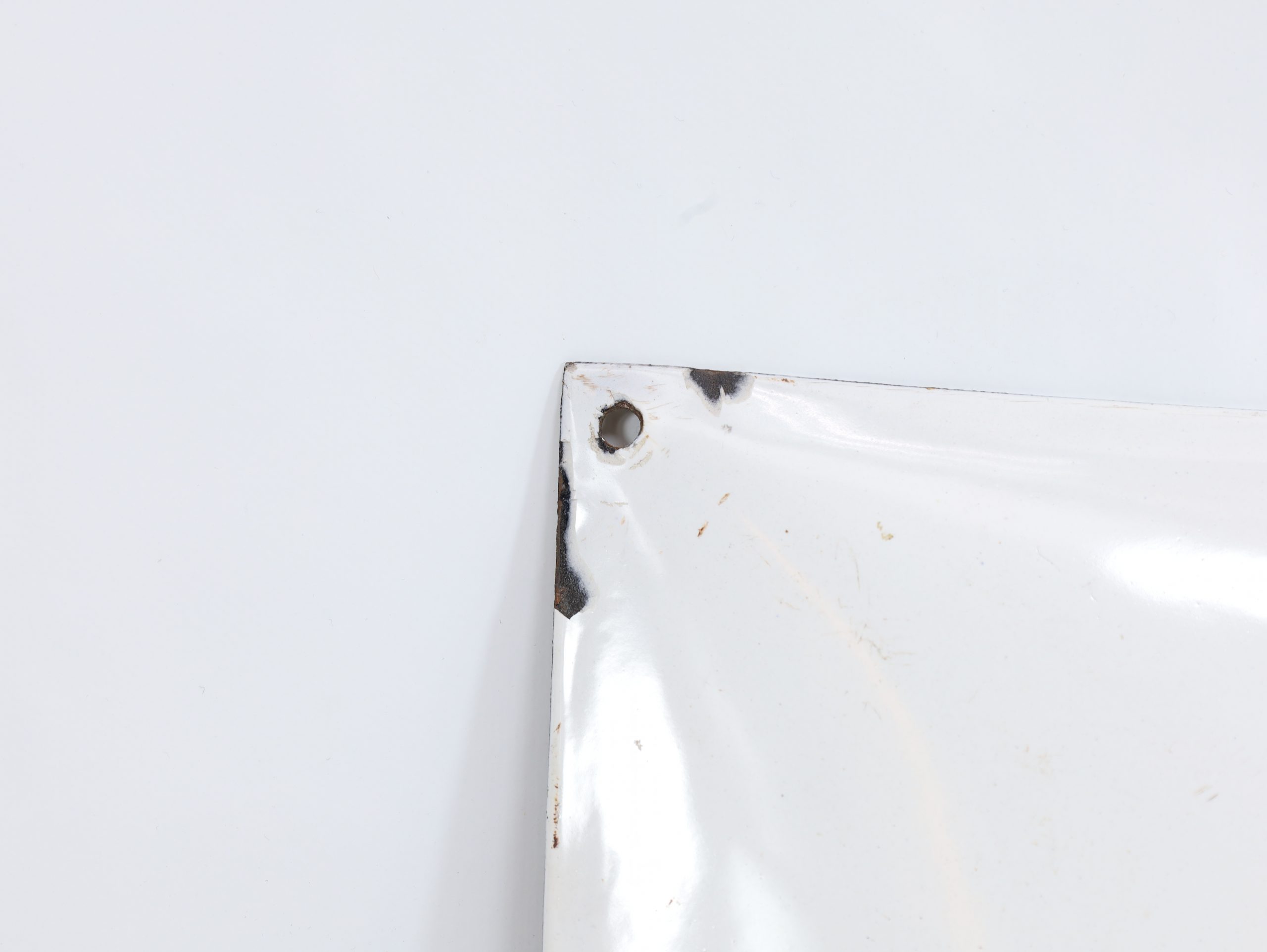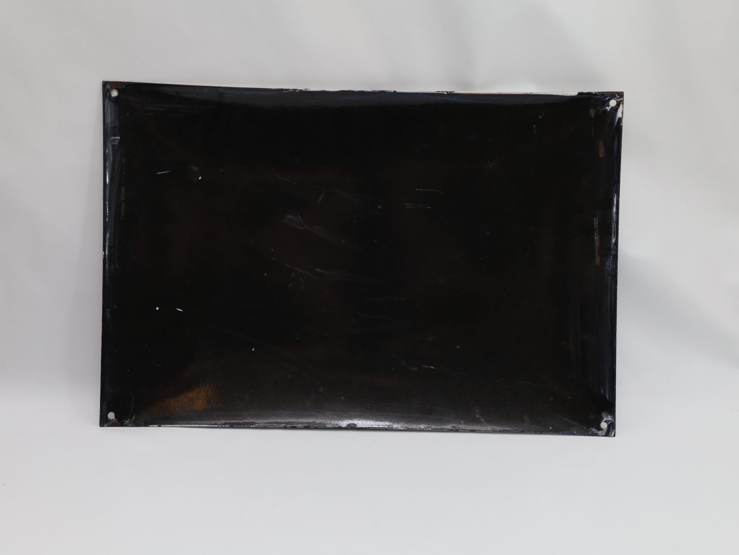 Merknader: Noe slitasje og korrosjon langs kantene, spesielt hullene for oppheng; små flekker, men teksten og logo godt bevart; overflate med normal emaljeslitasje; ingen store sprekker synlige på bildene.