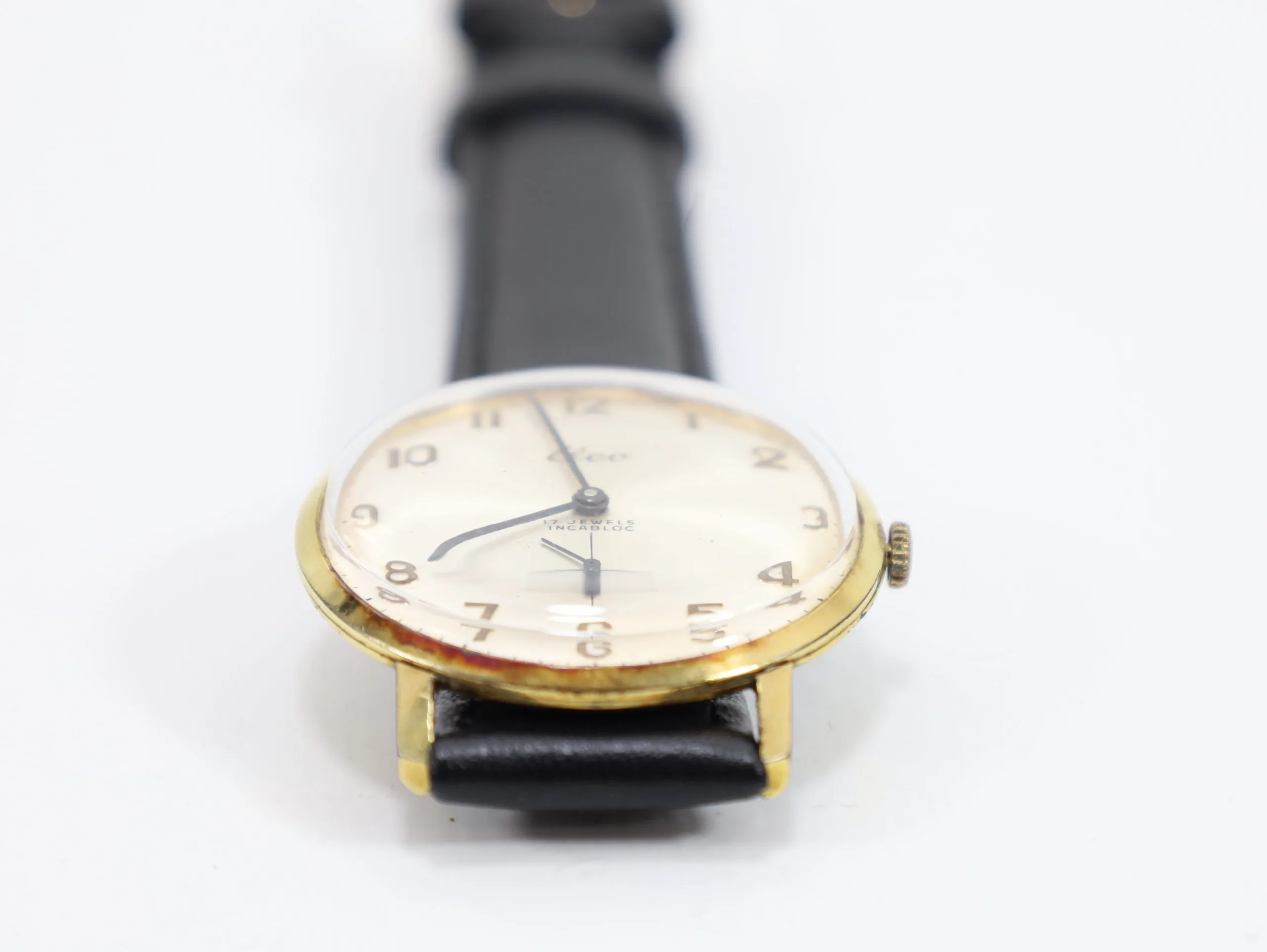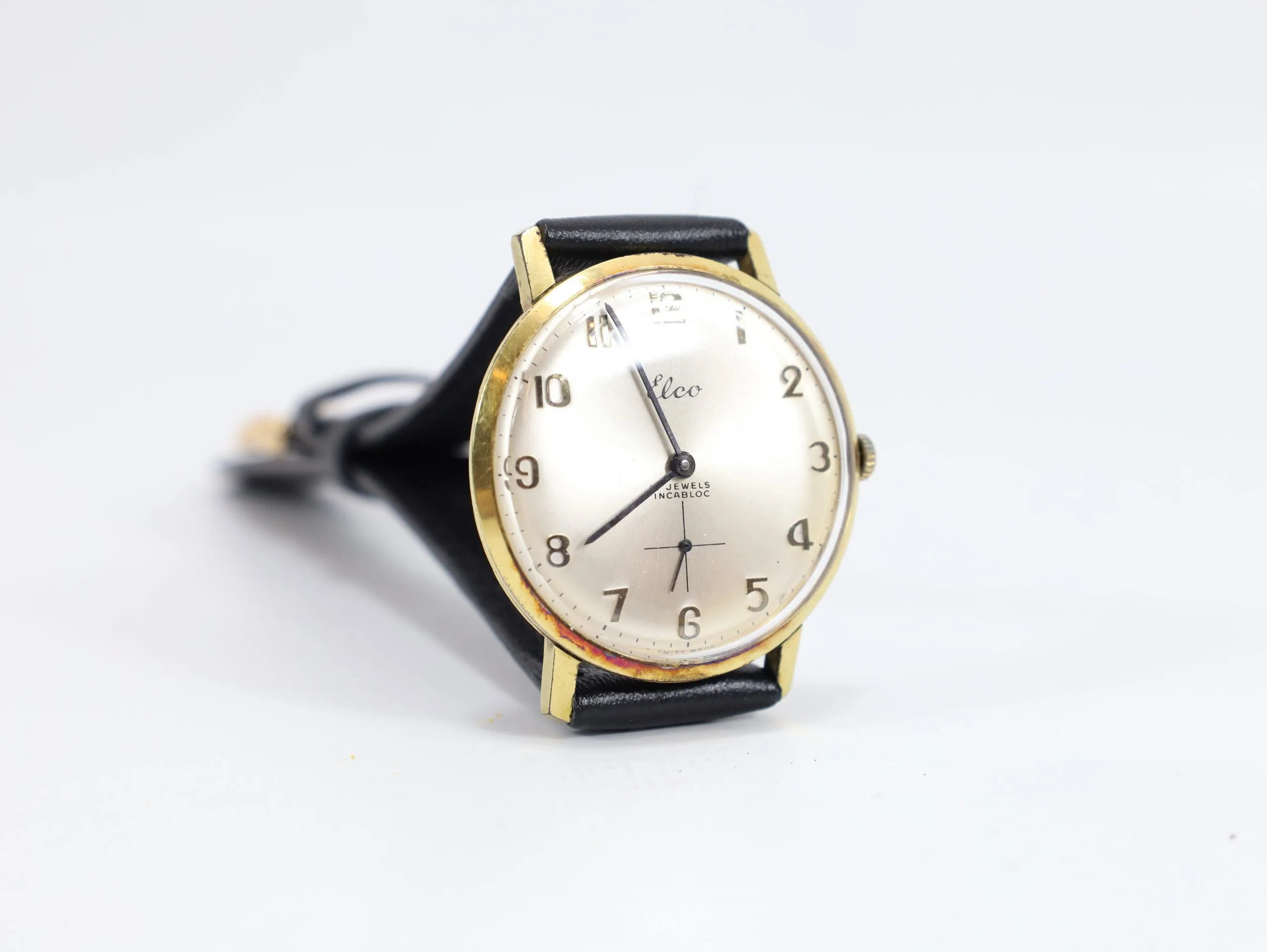 Elco armbåndsur med sveitsisk presisjon og klassisk vintage-stil. Denne klokken har et pålitelig mekanisk urverk med 17 jewels og Incabloc støtsikring – et kjent kvalitetskjennetegn på sveitsiske ur.