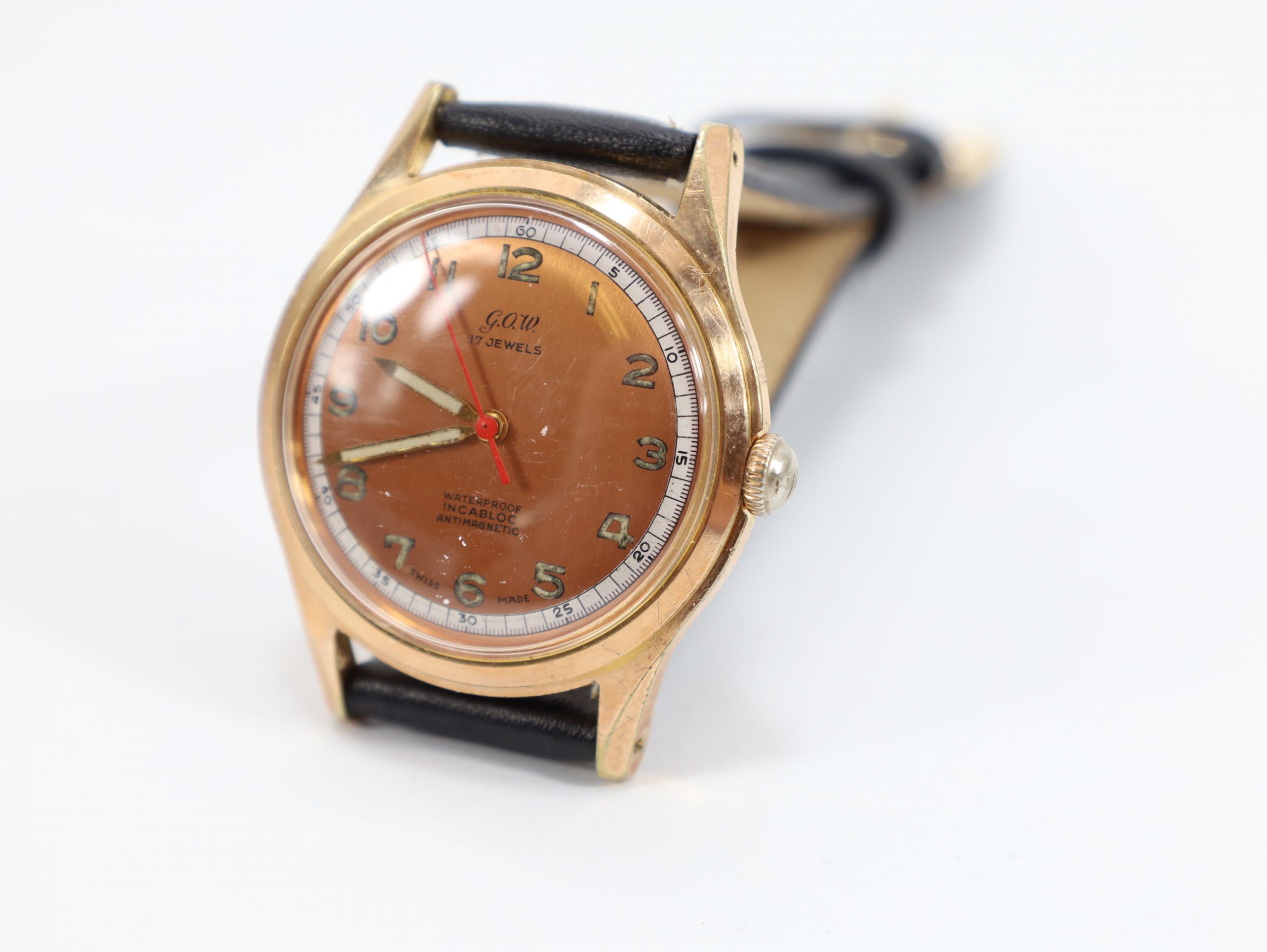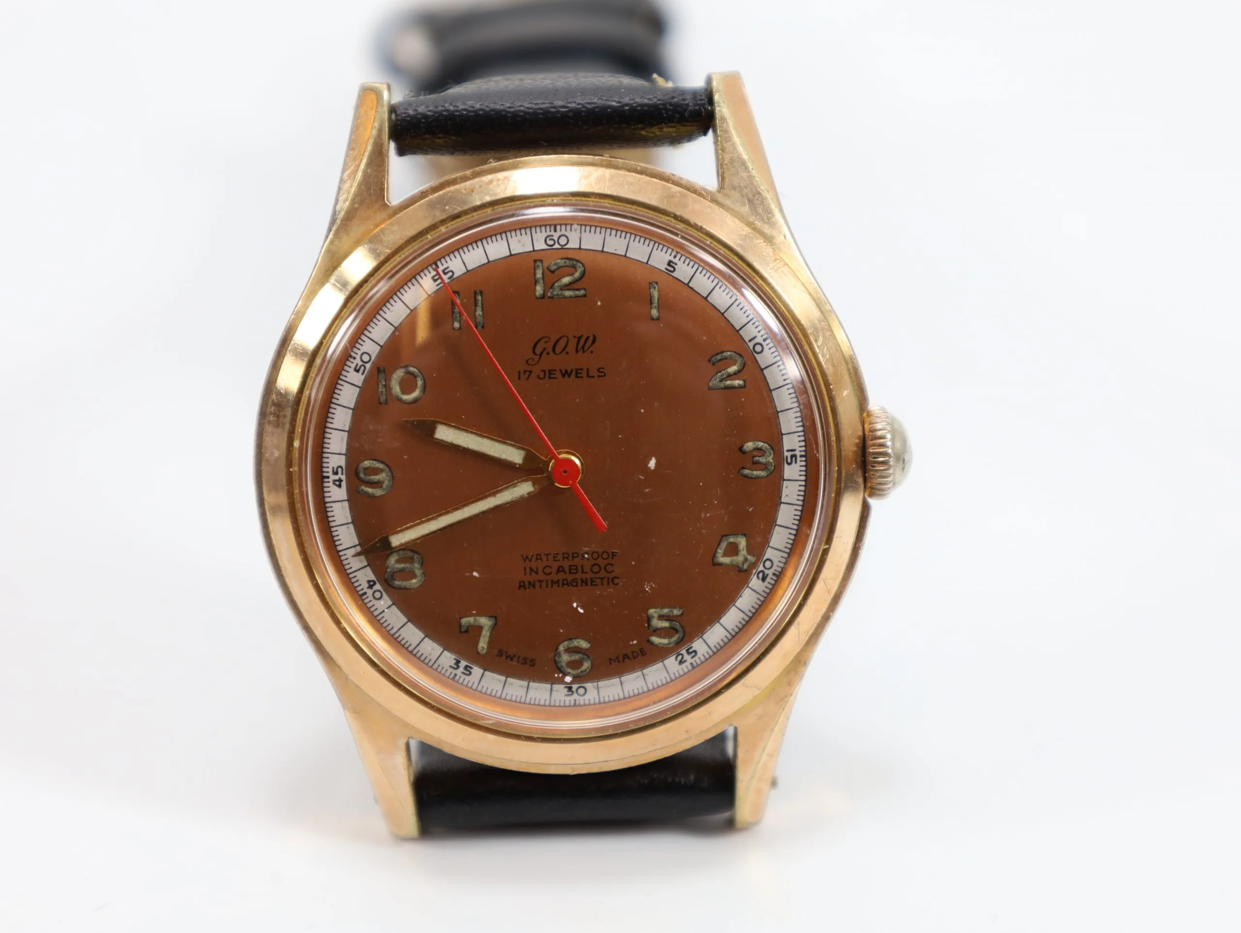 Flott vintage herreklokke fra G.O.W. med sveitsisk mekanisk urverk, 17 jewels Incabloc.