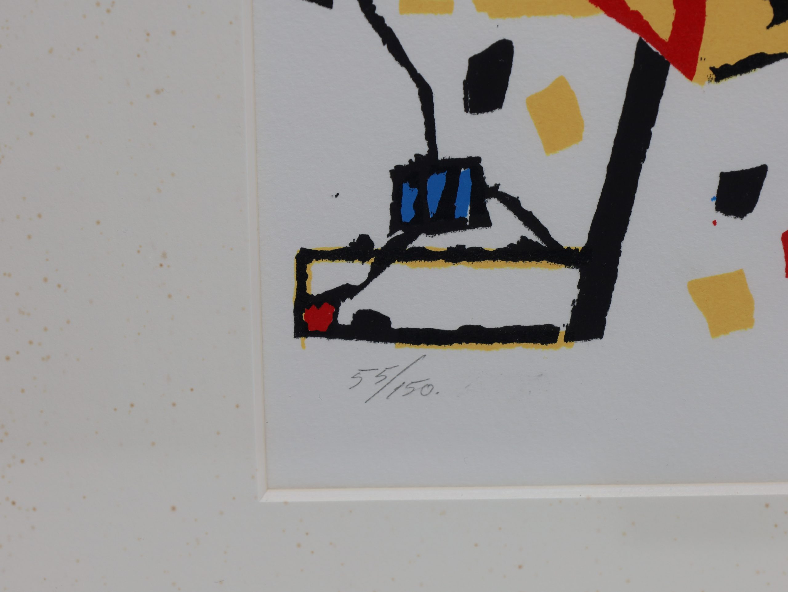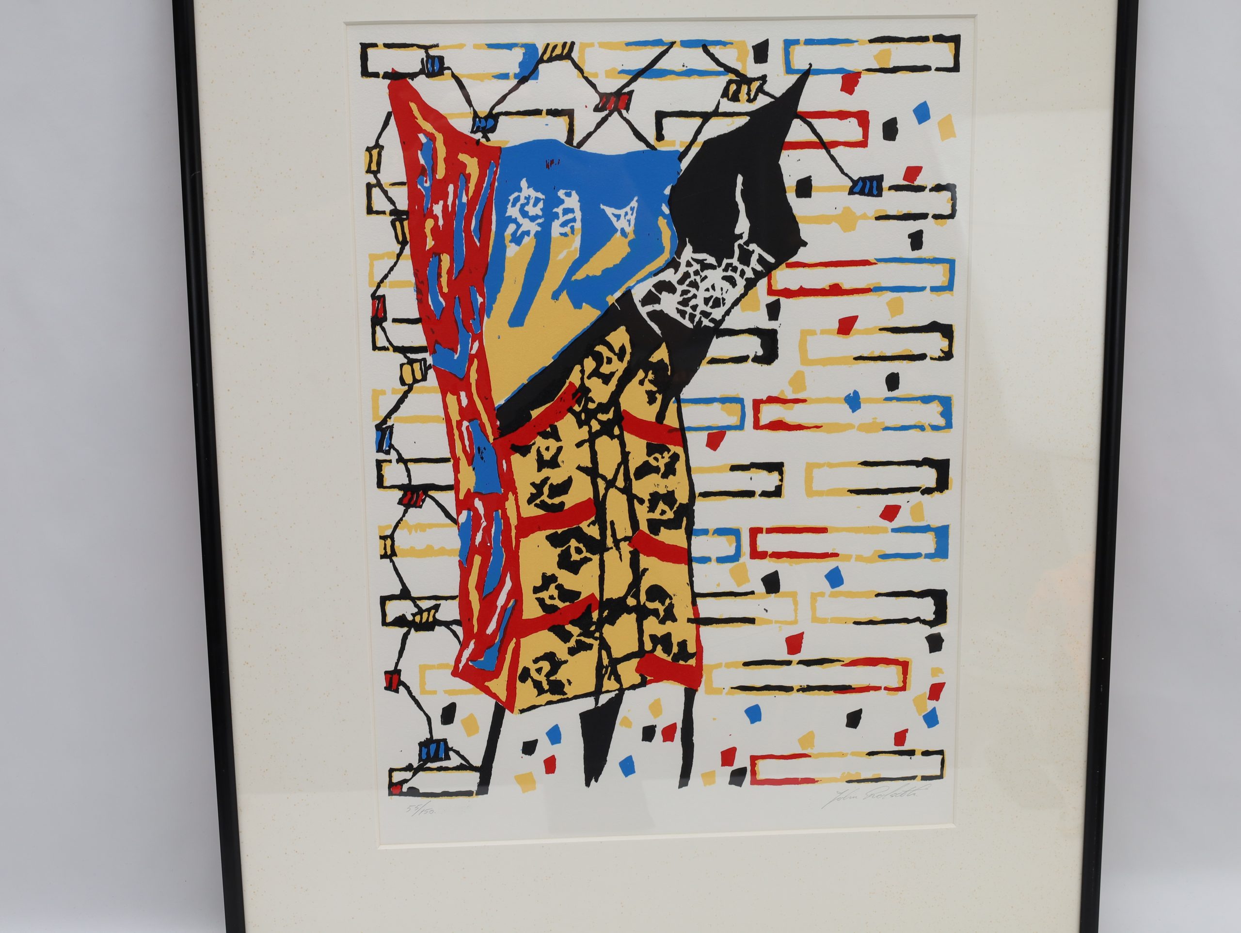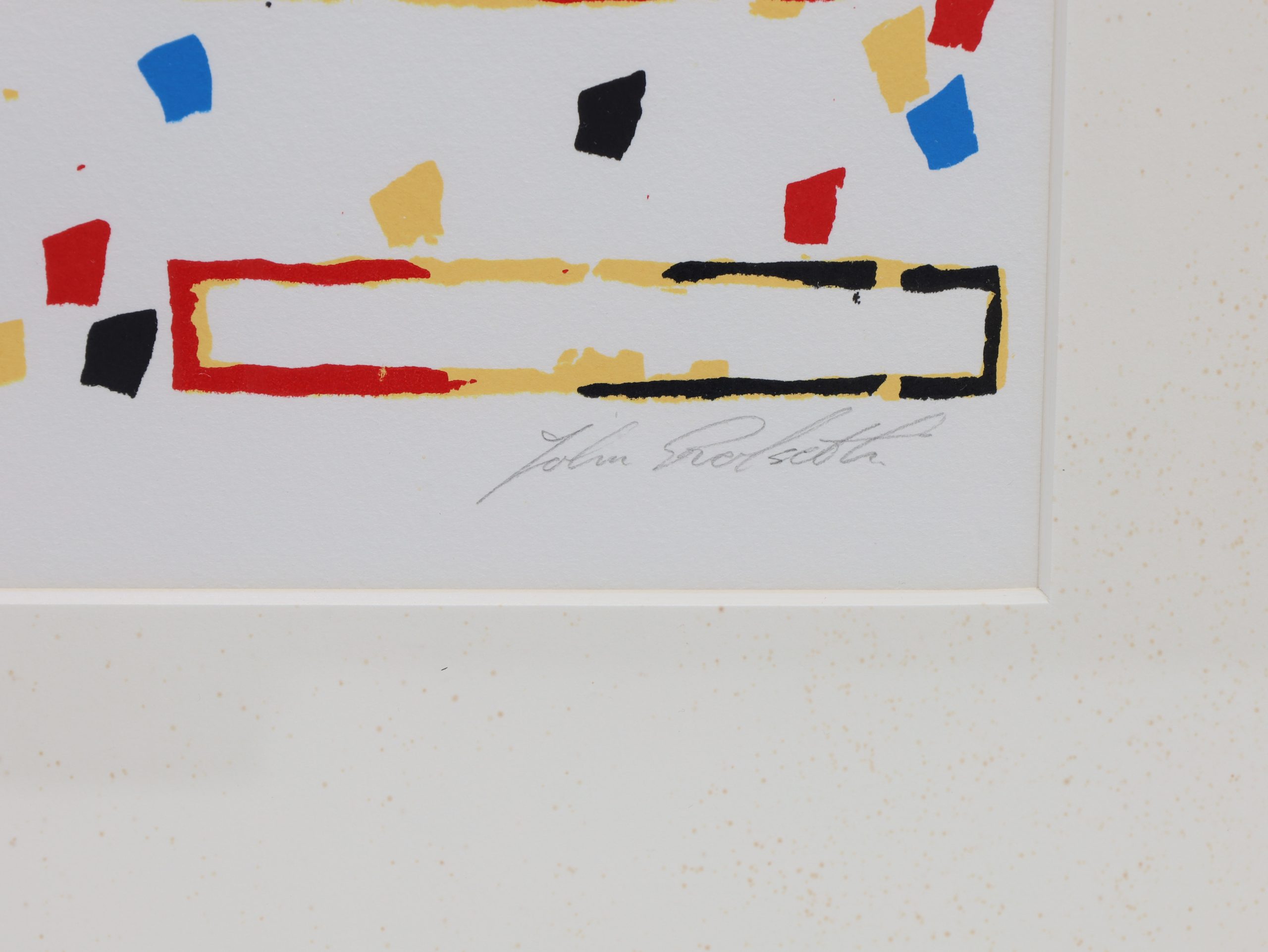 Originalt litografi av den norske kunstneren **John Rolseth**, kjent for sine fargerike og geometrisk inspirerte komposisjoner. Trykket kombinerer sterke primærfarger med rytmiske former og kontraster i svart, rødt, blått og gult.