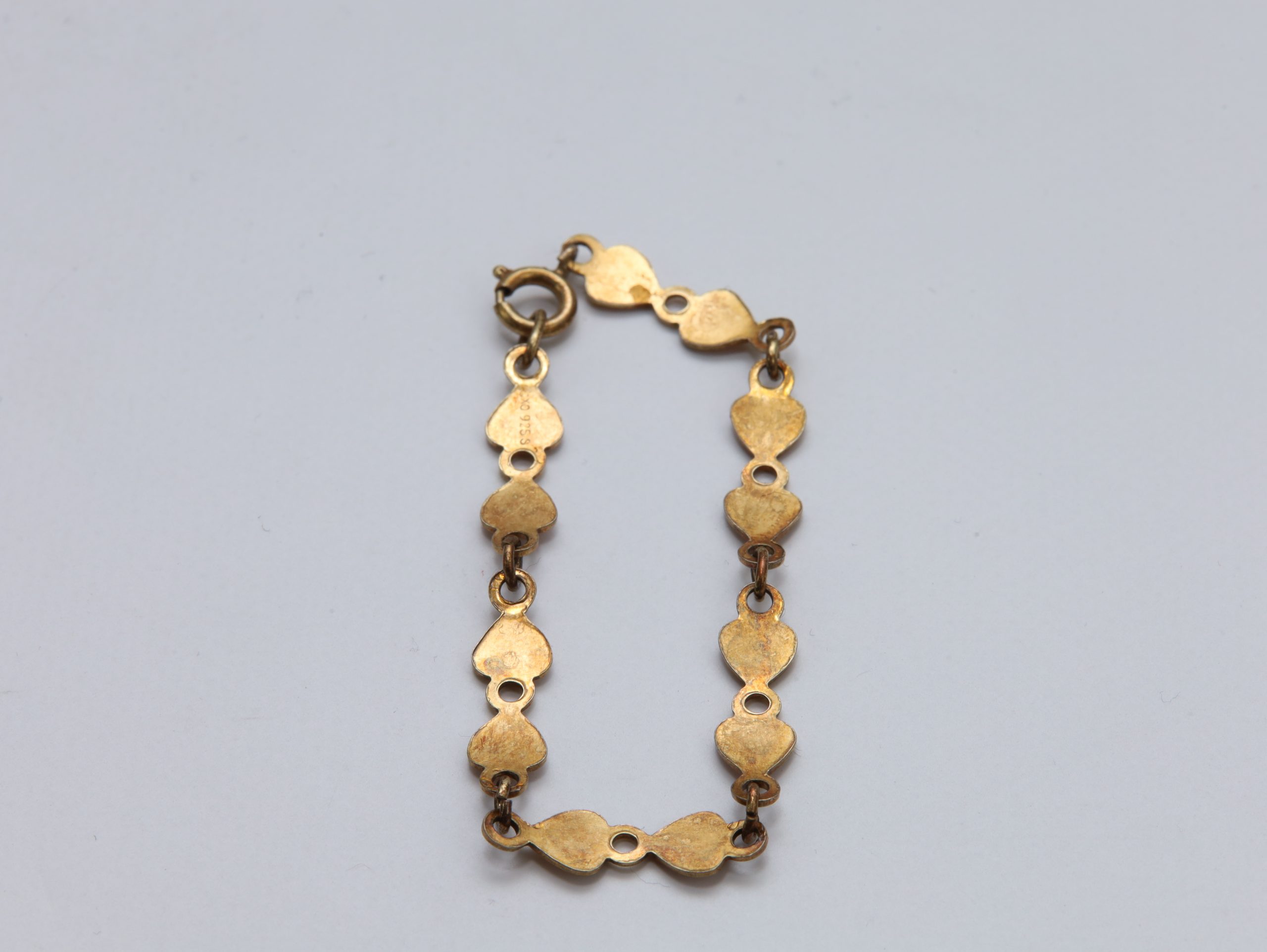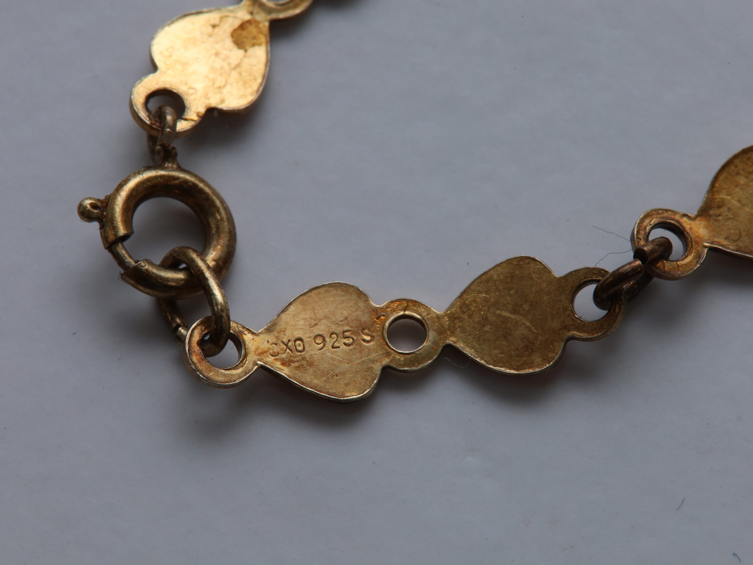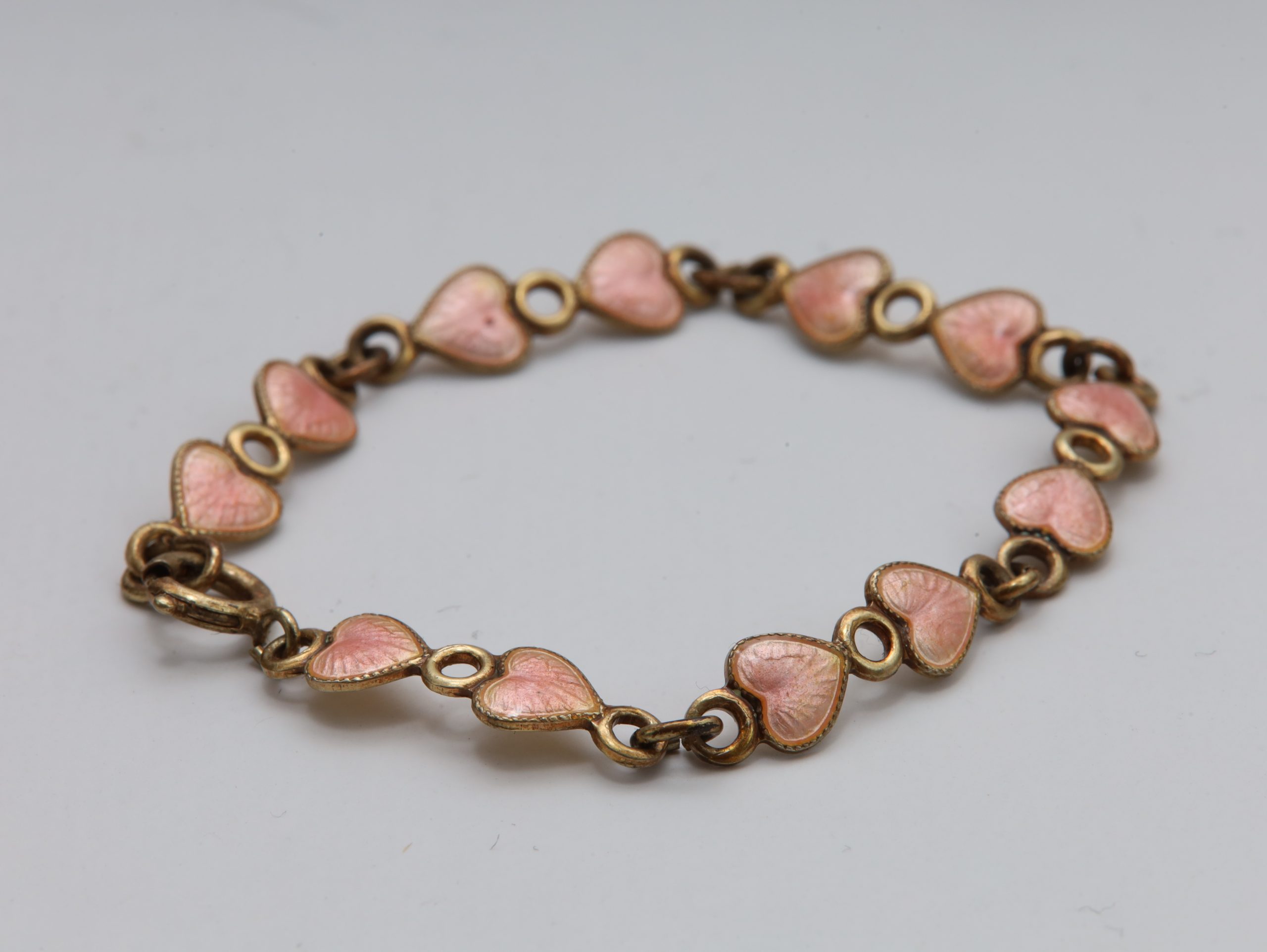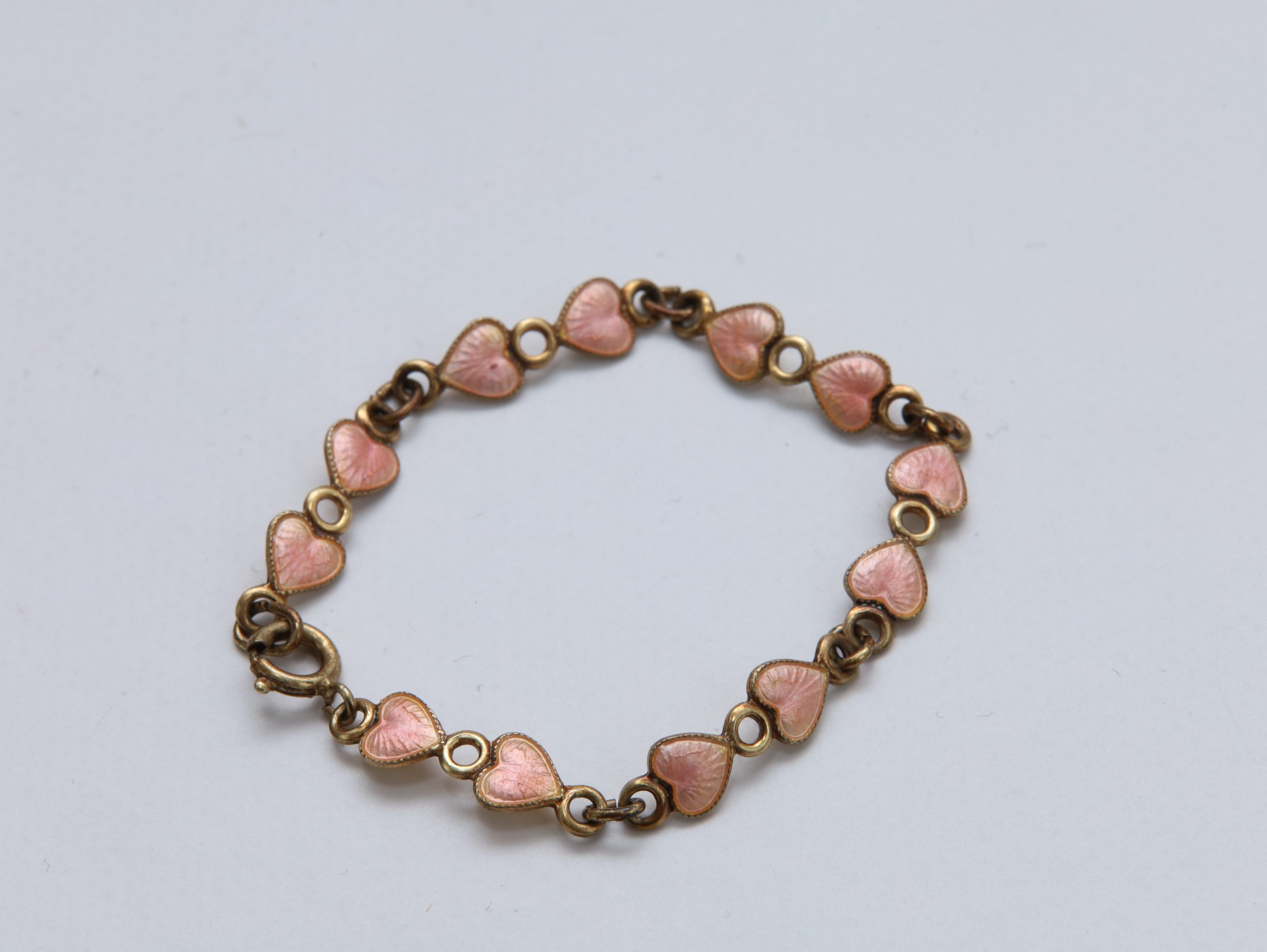 Laget i **925S sølv**, forgylt overflate, med vakker **rosa guilloché-emalje** på hjerteformede ledd.