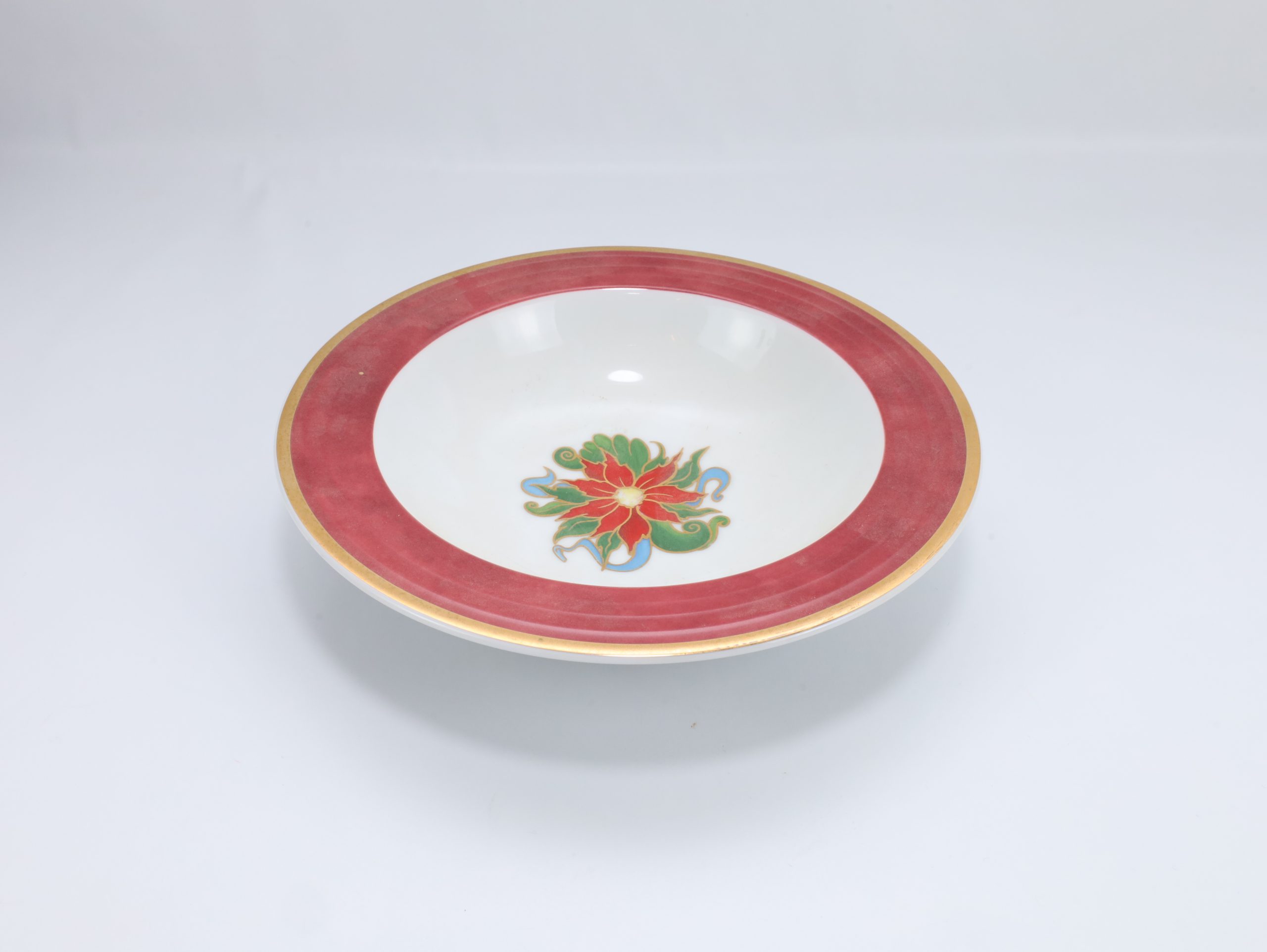 Denne dype tallerkenen er dekorert med poinsettia (juleblomst) og klassiske ornamental-detaljer. Passer perfekt som suppe-, grøt- eller desserttallerken i julen.