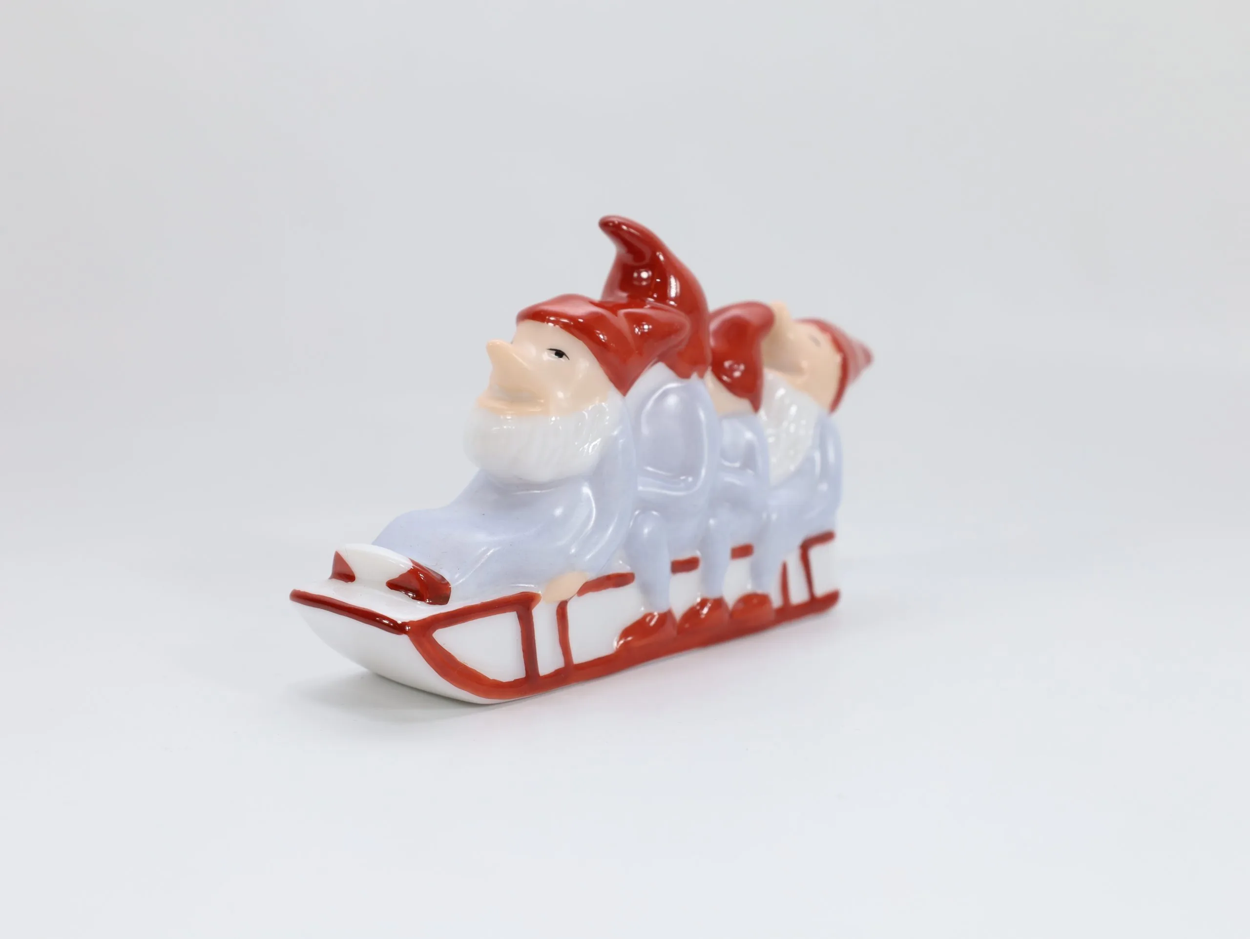 Dekorativ julefigur i glasert porselen fra Porsgrunds Porselænsfabrik. Motivet med nisser på slede er nært knyttet til fabrikkens tradisjonsrike Nisse-univers, hvis mønster opprinnelig ble tegnet i 1898 og satt i produksjon i 1900 – en norsk juleklassiker brukt av titusenvis av hjem.
