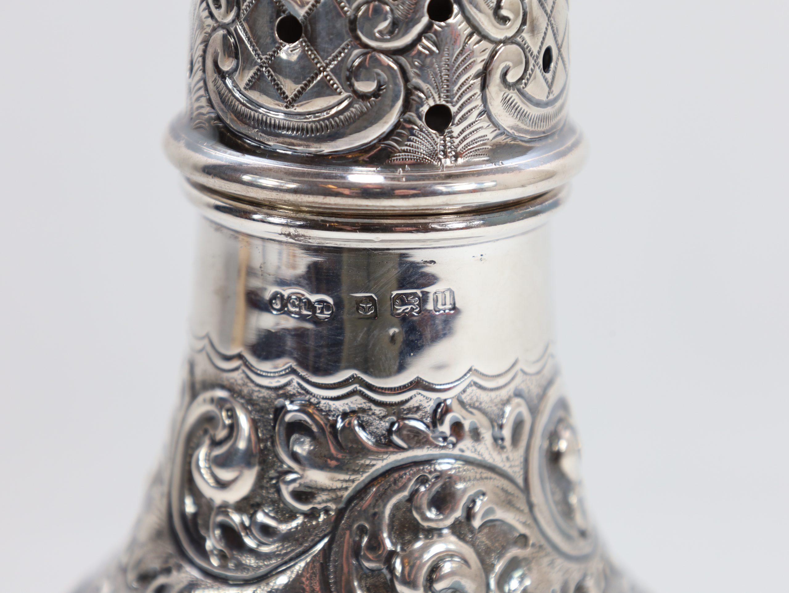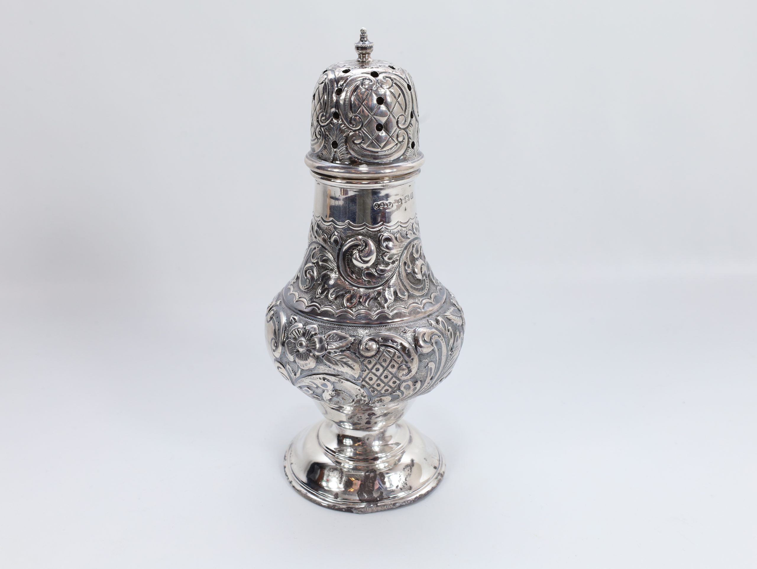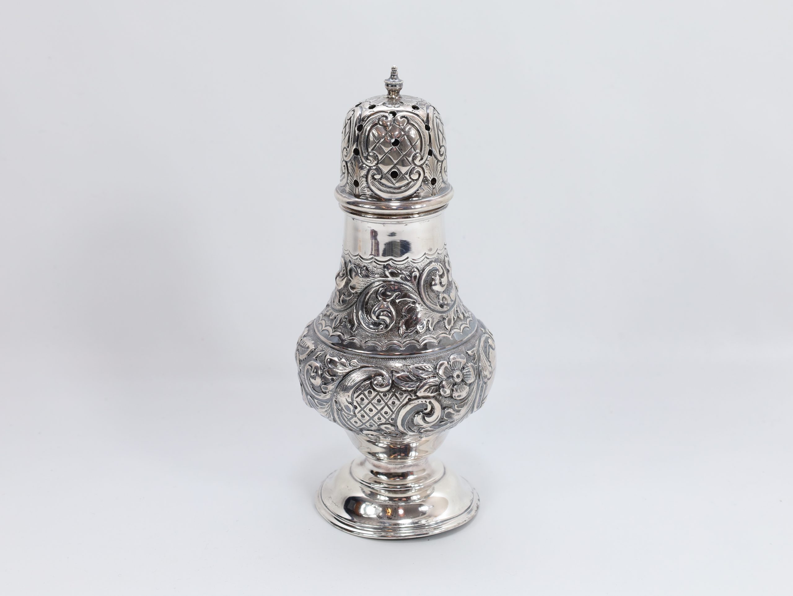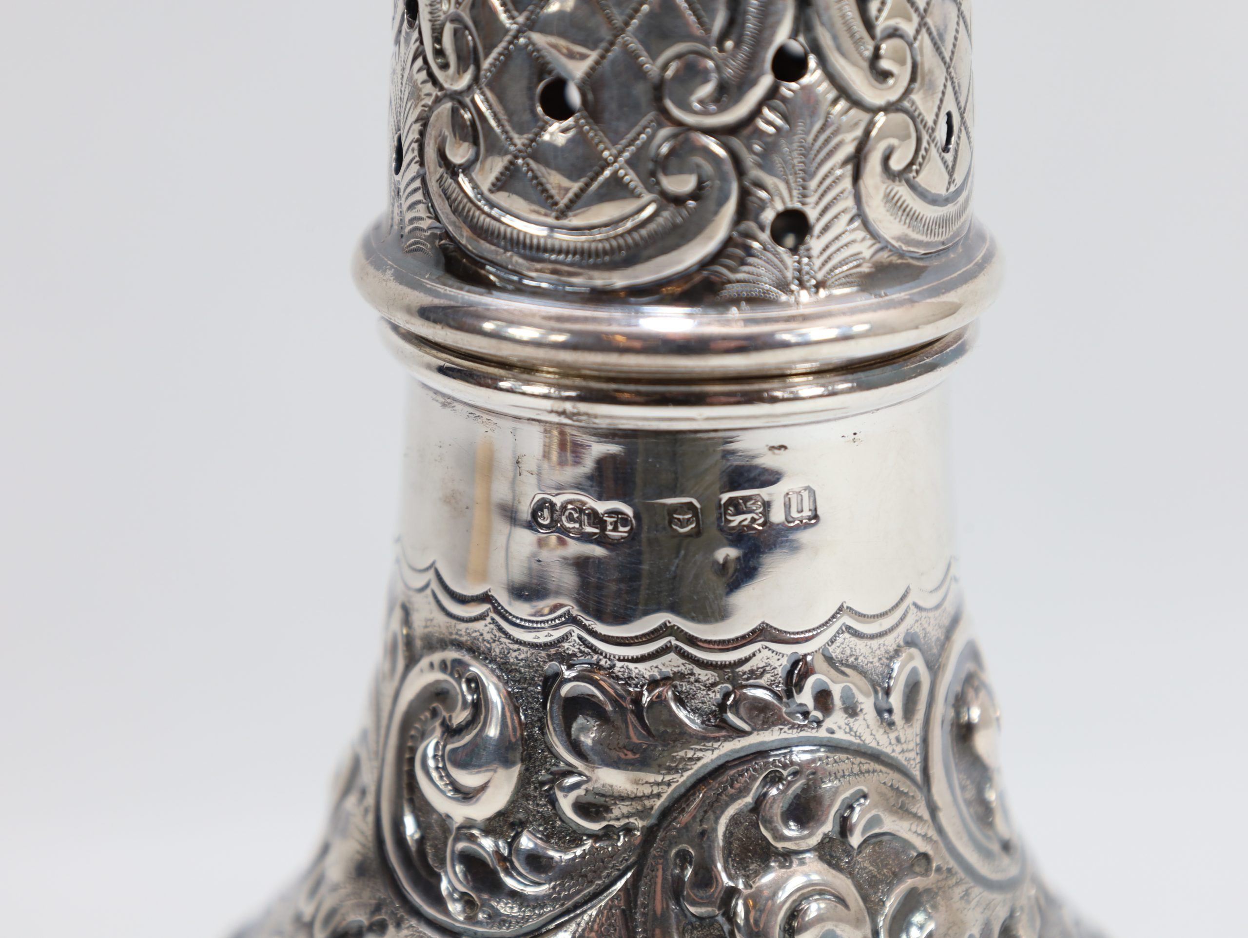 Vakkert gjennombrutt sukkerdryss i sterling sølv, rikt drevet dekor. Britiske stempler for Birmingham og sterling .925. Høyde 16,3 cm.