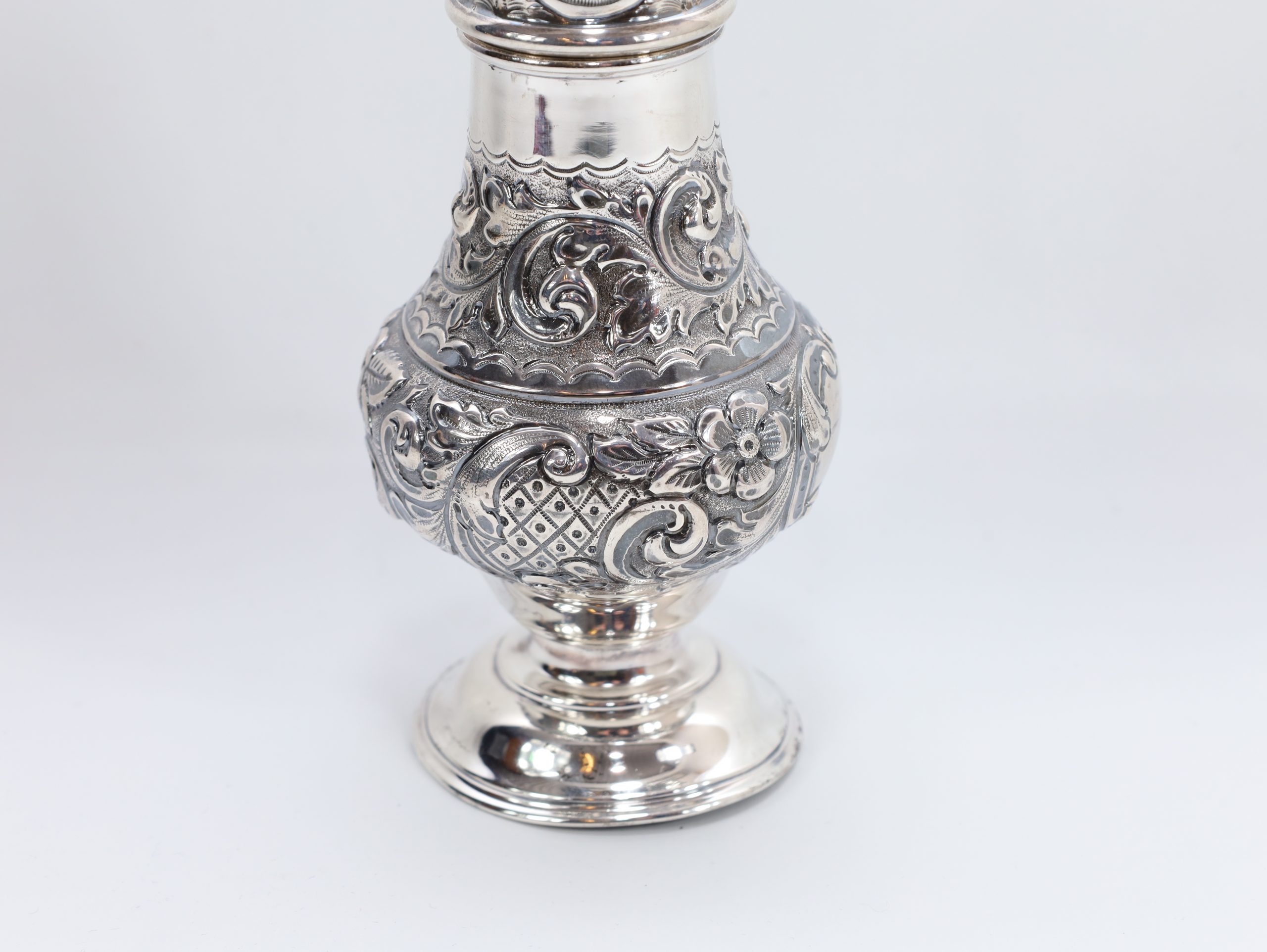 • Dekor: rikt drevet/repoussé rull- og blomsterornamentikk